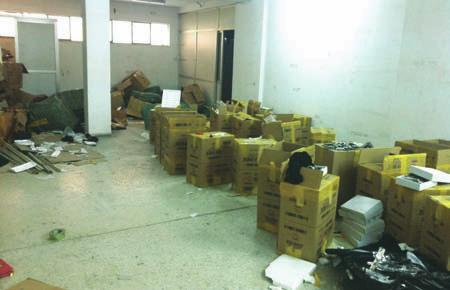Αποθήκη στην οδό Μενάνδρου στο κέντρο της Αθήνας. Οι αστυνομικοί βρή-καν σ’ αυτή 12.000 ζευγάρια παπούτσια.