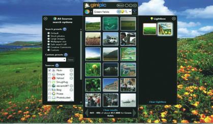 νοντας σε αυτές το δικό σας δίσκο, αν θέλετε. Μετά την εύρεση της εικόνας που ψάχνετε, μπορείτε, πολύ απλά και εύκολα, να τη χρησι-μοποιήσετε, σύροντάς τη στο πρόγραμμα με το οποίο σκοπεύετε να την επεξεργαστείτε, απλά να την αποθηκεύσετε. Εκτός των εξαιρετι-κά χρήσιμων σε αρκετούς δυνατοτήτων του, το Ginipic διαθέτει όμορφο, λιτό και καλοσχεδιασμένο περιβάλλον.
