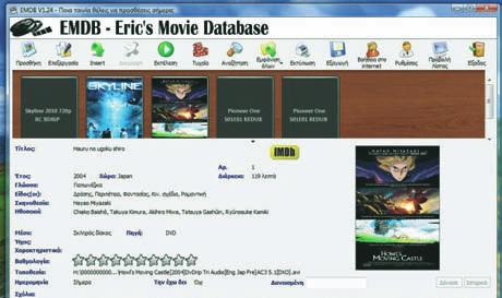 Το EMDB είναι ένα μικρό πρόγραμμα ειδικά σχεδιασμένο για να σας βοη-θήσει να διαχειριστείτε τη συλλογή των DVD ταινιών σας. Παρέχει έναν αυτόματο μηχανισμό εισαγωγής πληροφοριών για τις ταινίες σας από το δημοφιλή ιστότοπο IMDB, προεπισκόπηση εξωφύλλου, έναν loan tracker για να κρατάτε λογαριασμό τι έχετε νοικιάσει, δανειστεί ή δανείσει, μηχανι-σμό αναζήτησης και μεγάλη ποικιλία γλωσσών για το περιβάλλον, ανάμεσα στις οποίες και η ελληνική. Το πρόγραμμα είναι γραμμένο σε Visual C++ 6.0 και δεν χρειάζεται εξωτερικά binaries, όπως το .NET framework. Η χρήση του είναι απλή, αφού το μόνο που χρειάζεται, είναι η εισαγωγή του τίτλου και το πάτημα του πλήκτρου Search IMDB για την εύρεση όλων των στοιχείων που αφορούν στην ταινία σας. Αν η ταινία βρίσκεται στο δίσκο, μπορείτε να την εισαγάγετε απλώς πατώντας το κουμπί Αναζήτηση HDD, αλλά και να ξεκινήσετε την αναπαραγωγή της μέσα από το περιβάλλον του προγράμματος.