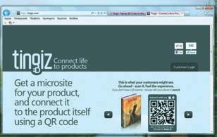 Ίσως έχει τύχει να δείτε τα χαρακτηρι-στικά ασπρόμαυρα τετράγωνα του QR Code, του δισδιάστατου γραμμωτού κώδικα που χρησιμοποιείται για την παροχή περισσότερων πληροφοριών πάνω σε κάποιο διαφημιζόμενο προϊόν ή στο αντικείμενο κάποιου άρθρου σε περιοδικό. Το πλεονέκτημα του QR Code είναι ότι αρκεί να στοχεύσετε με την κάμερα του κινητού σας το τετρά-γωνο που έχει τυπωθεί σύμφωνα με αυτόν τον κώδικα, για να μεταφερθείτε στο site με τις πληροφορίες. Αξίζει να αναφερθεί ότι υπάρχουν διαθέσιμα δωρεάν προγράμ-ματα QR Code για όλες τις κύριες πλατφόρμες κινητών. Το Tingiz είναι ένα ενδιαφέ-ρον site, το οποίο σας επιτρέπει να αξιοποιήσετε αυτή την τεχνολογία για την προώ-θηση των προϊόντων σας, χτίζοντας εύκολα microsites προσβάσιμα μέσω QR Code και μελλοντικά μέσω και άλλων ανάλογων τεχνολογιών. Το site βρίσκεται ακόμη σε στάδιο Alpha και πρέπει να δώσετε το e–mail σας και να περιμένετε να σας παραχω-ρηθεί πρόσκληση.