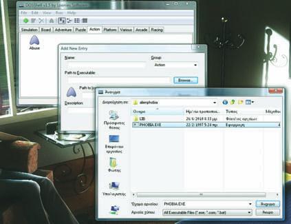 και να τον επιλέξετε. Κατά πάσα πιθανότητα είναι ο C:\Program Files\DOSBox–0.74. Εί-στε πλέον έτοιμοι να ξεκινήσετε την εγκατά-σταση των παιχνιδιών που θέλετε. Και πάλι, είναι καλό τα παιχνίδια να βρίσκονται σε έναν εύκολα προσβάσιμο φάκελο. Για να εγκαταστήσετε ένα παιχνίδι, κάντε κλικ στον πράσινο σταυρό πάνω αριστερά, στο περιβάλλον του προγράμματος. Στο πλαί-σιο διαλόγου που θα εμφανιστεί, γράψτε στο πεδίο Name το όνομα του παιχνιδιού. Στο πε-δίο Group γράψτε το είδος του (π.χ., Action). Αν αυτή η κατηγορία ήδη υπάρχει, επειδή προηγουμένως έχετε εισαγάγει και άλλο παι-χνίδι, επιλέξτε την από τη λίστα. Στο πεδίο Path to Executable, πρέπει να