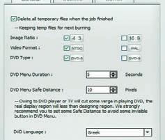 Στην ίδια οθόνη θα βρούμε και άλλες επιλογές, όπως οι αναλογίες οθόνης (4:3 ή 16:9), το τηλεοπτικό σύστημα (NTSC ή PAL) και η χωρητικότητα του DVD (DVD 5 ή DVD 9).