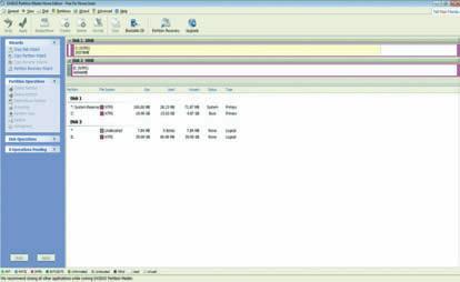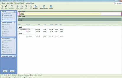 1 Στο περιβάλλον του προγράμματος, βλέπουμε χάρτη όλων των δίσκων και partitions, με πληροφορίες για το σύστημα αρχείων, καθώς και τον αδιάθετο ακόμη χώρο. Στην μπάρα αριστερά φαίνονται οι ψηφιακοί βοηθοί και οι λειτουργίες για δίσκους και partitions.
