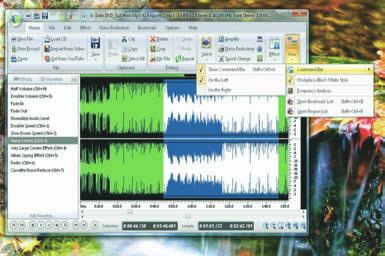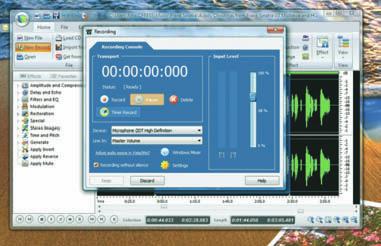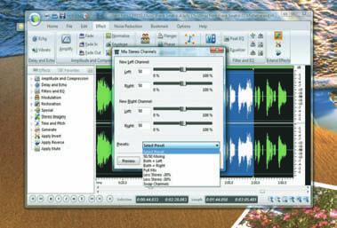Η καρτέλα Effects περιέχει γνωστά εφέ, όπως τα Echo, Vibrato, Fade, Chorus κ.λπ. Επίσης, εδώ υπάρχει ενισχυτής, κανονικοποίηση της έντα-σης, αλλαγή ταχύτητας και τονικότητας, ισοσταθμιστής, φίλτρα για υψη-λές, μεσαίες και χαμηλές συχνότητες κ.ά. Στο τμήμα Extend Effects, θα βρείτε κουμπιά για μείξη των καναλιών ενός στερεοφωνικού αρχείου (εικ. 4), αναστροφή της κυματομορφής του επιλεγμένου τμήματος και, τέλος, αντιστροφή της, ώστε να παίζει από το τέλος προς την αρχή. Η καρτέλα Noise Reduction έχει τρεις επιλογές ελάττωσης θορύβου: Μία γενική και δύο με έτοιμες ρυθμίσεις για θόρυβο από κασέτα και για τον ήχο της αναπνοής ενός ομιλητή.