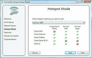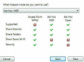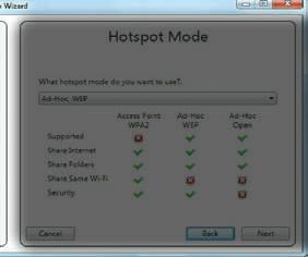 2 Στο HotSpot Mode έχουμε τρεις επιλογές, τα χαρακτηριστικά των οποίων φαίνονται στο κάτω μέρος. Αν η επιλογή Access Point WPA2 υποστηρίζεται από την ασύρματη κάρτα του υπολογιστή είναι η προτιμότερη, καθώς προσφέρει τη μεγαλύτερη ασφάλεια.