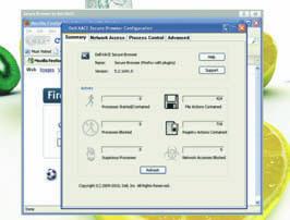 Ο Secure Browser περικλείει το πρόγραμμα περιήγησης στο Διαδίκτυο σε ένα δικό του εικονικό περιβάλ-λον, μέσα στο οποίο περιορίζονται όλα τα προβλήματα που θα μπορούσαν να προκύψουν από την πρόσβαση σε επικίνδυνες ιστοσελίδες. Βασίζεται στον Firefox 3.6 browser, ο οποίος πλαισιώνεται από τον Adobe Reader, καθώς και Flash plug–ins. Η μόνη ορατή διαφορά του Secure Browser από τον κανονικό Firefox εί-ναι μία λεπτή ημιδιαφανής μπάρα στο πάνω μέρος. Αυτή η μπάρα έχει στη δεξιά γωνία δύο κουμπιά. Το πρώτο είναι για την επαναφορά του προγράμματος στην αρχική κατάσταση. Πατώντας το, το πρόγραμμα κλείνει και, όταν ανοί-ξει ξανά, είναι σαν καινούργιο. Το δεύτερο από τα κουμπιά της toolbar ανοίγει μία καρτελοθήκη, όπου μπορείτε να δείτε σύνοψη της των δράσεων του προγράμματος, καθώς και να το ρυθμίσετε. Η σύνοψη παρουσιάζεται στην πρώτη καρτέλα, τη Summary. Προκειμένου να δείτε τις υπόλοιπες καρτέλες της καρτελοθήκης, πρέπει να έχετε τρέξει το πρόγραμμα με δικαιώματα διαχειρι-στή. Η καρτέλα Network Access σάς επιτρέπει να ελέγξετε την πρόσβαση στο Διαδίκτυο. Τσεκάροντας το κουτάκι στην κορυφή, ενεργοποιείτε τις επιλογές της. Στη συνέχεια, μπορείτε να εισαγάγετε διευθύνσεις και να επιτρέπετε ή να απαγορεύετε την πρόσβαση σε αυτές με τα κουμπιά Allow και Block, δημιουργώντας αντίστοιχα «λευκή» και «μαύρη» λίστα. Πατώντας το κουμπί Start Recording, ενεργοποιείται η πολύ βολική δυνατότητα αυτόματης καταγραφής των sites που θα περιληφθούν στη λευκή λί-στα. Με ανάλογο τρόπο μπορούμε να δημιουργήσουμε λίστες απαγορευμένων και επιτρεπόμενων προγραμμάτων που θα μπο-ρούν να τρέξουν από τον browser, χρησιμοποιώντας τις επιλογές της καρτέλας Process Control.