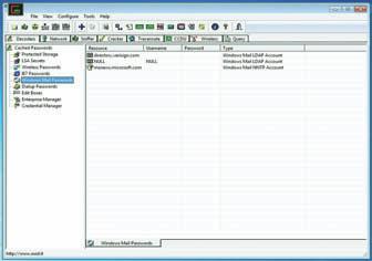 ΑΠΑΙΤΗΣΕΙΣ: Windows 2000/XP/Vista/7 Π ρόγραμμα το οποίο εξειδικεύεται στην ανάκτηση χαμέ-νων κωδικών. Είναι σε θέση να ανακτήσει πολλών ειδών κωδικούς, παρακολουθώντας την κίνηση στο τοπικό δί-κτυο (network sniffing), σπάζοντας κρυπτογραφημένους κωδι-κούς με τις μεθόδους Dictionary, Brute–Force και Cryptanalysis, εντοπίζοντας και καταγράφοντας VoIP συνομιλίες, αποκαλύπτο-ντας τα password boxes, ανακτώντας αποθηκευμένους κωδι-κούς από τα Windows και τον Internet Explorer και με αρκετές ακόμη μεθόδους. Το πρόγραμμα, φυσικά, απευθύνεται σε δια-χειριστές δικτύων για την εξασφάλιση της ασφάλειάς τους και σε προχωρημένους χρήστες για την ανάκτηση κωδικών. Υπο-στηρίζει ανάκτηση κωδικών μέσω sniffing στα πιο δημοφιλή πρωτόκολλα, όπως FTP, SMTP, POP3, HTTP, mySQL, ICQ, Telnet, ενώ υποστηρίζει και τα περισσότερα πρωτόκολλα ασύρ-ματων δικτύων. Στο ίδιο το πρόγραμμα ενσωματώνονται και επιπλέον χρήσιμα εργαλεία για το διαχειριστή δικτύων, όπως η